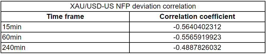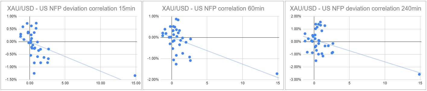 Trazamos la reacción del precio del oro a la publicación del NFP en intervalos de 15 minutos, una hora y cuatro horas después de la publicación. Luego, comparamos esta reacción con la desviación entre el resultado real de la publicación del NFP y la cifra esperada.