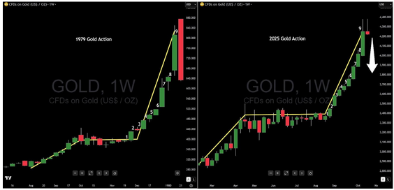 |Mientras muchos dicen ‘esta vez es diferente’, solo estoy parcialmente de acuerdo. El Oro está repitiendo la acción de precios de 1979 casi a la perfección. En 1979, el Oro tuvo un aumento, luego una larga base de consolidación, y luego un último aumento parabólico. Esto estableció un máximo importante que duraría décadas. En 2025, el Oro subió a principios de año, se consolidó lateralmente, y desde entonces ha realizado un aumento parabólico. Se ha formado el mismo patrón, casi al pie de la letra.