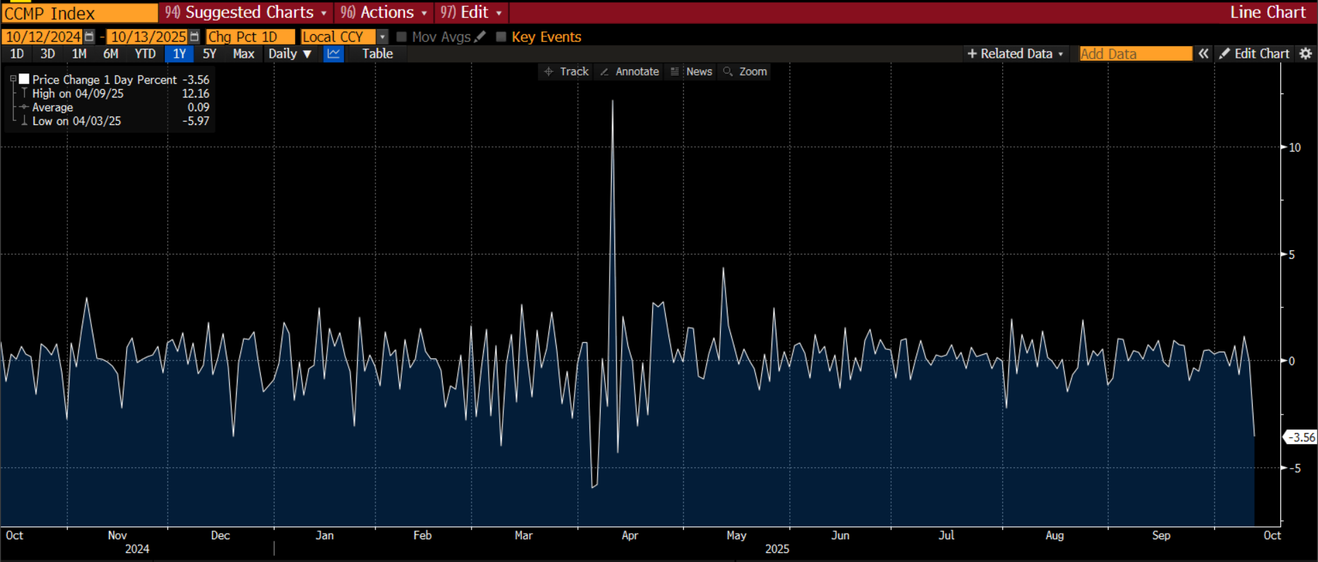 Aunque se espera que los mercados de acciones registren una recuperación hoy, la fuerte caída de las acciones el viernes es una advertencia para el mercado. El aumento de las tensiones comerciales entre las dos economías más grandes del mundo sorprendió a los operadores, la volatilidad se disparó, y las acciones se vendieron con la mayor caída desde el ‘Día de la Liberación’ en abril, con una caída del 3.5% para el Nasdaq y una caída del 2.7% para el S&P 500.
