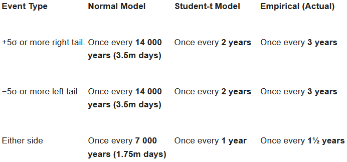 El platino tuvo un día a la baja de 7 sigma, el noveno en 47 años. Por diversión, ejecuté el modelo t de Student. Esto debería ocurrir cada 780.000 millones de días con modelos de distribución normal. Una vez cada 1.600 días usando nuestro modelo, es decir, cada 6 años.