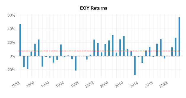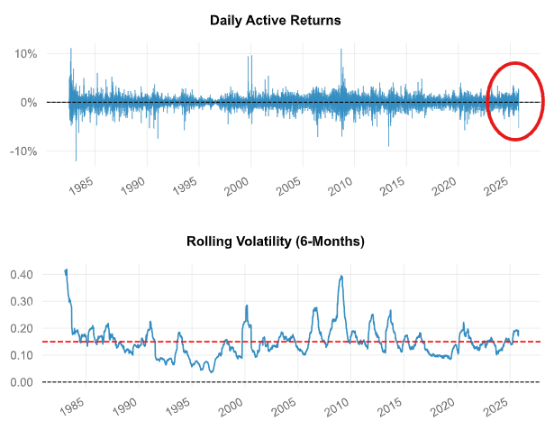 Cuando miramos los rendimientos diarios del Oro últimamente, vemos algunos movimientos más grandes de lo habitual, pero nada completamente fuera de lo normal en la historia de 50 años del Oro. Lo mismo se puede decir de una ventana de retroceso de volatilidad de 6 meses. Está solo ligeramente por encima de su media.
