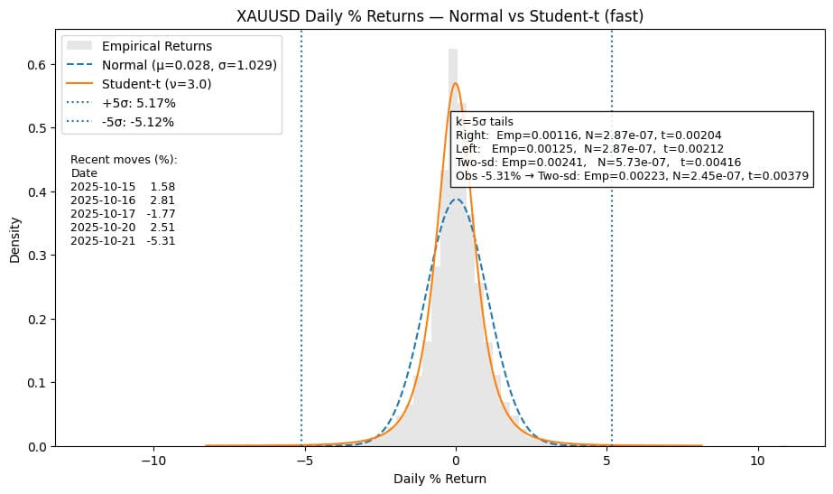 Hemos tenido algunos DÍAS GRANDES en el Oro en los últimos 5 días de negociación; en lugar de trabajar con los desesperadamente inadecuados cálculos de probabilidad de la distribución normal, pensé que sería útil utilizar un modelo mucho más preciso para calcular la verdadera probabilidad con las colas más realistas más presentes.