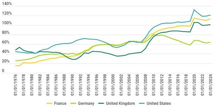 Tras una década de quantitative easing que comprimió las primas por plazo y facilitó la aritmética fiscal, ahora vivimos el escenario opuesto. El quantitative tightening devuelve la duración a los inversores, hay menos compradores insensibles al precio y la política es más volátil. Se trata de un fenómeno global, pero por ahora Estados Unidos –protegido por su estatus de moneda de reserva– está sometido a menos presión inmediata, aunque su trayectoria dista de ser ejemplar. Nos centraremos en Francia y el Reino Unido: los mercados están especialmente preocupados por estos países, ya que los niveles de endeudamiento son elevados, el coste de la deuda aumenta y los déficits públicos siguen siendo persistentes.