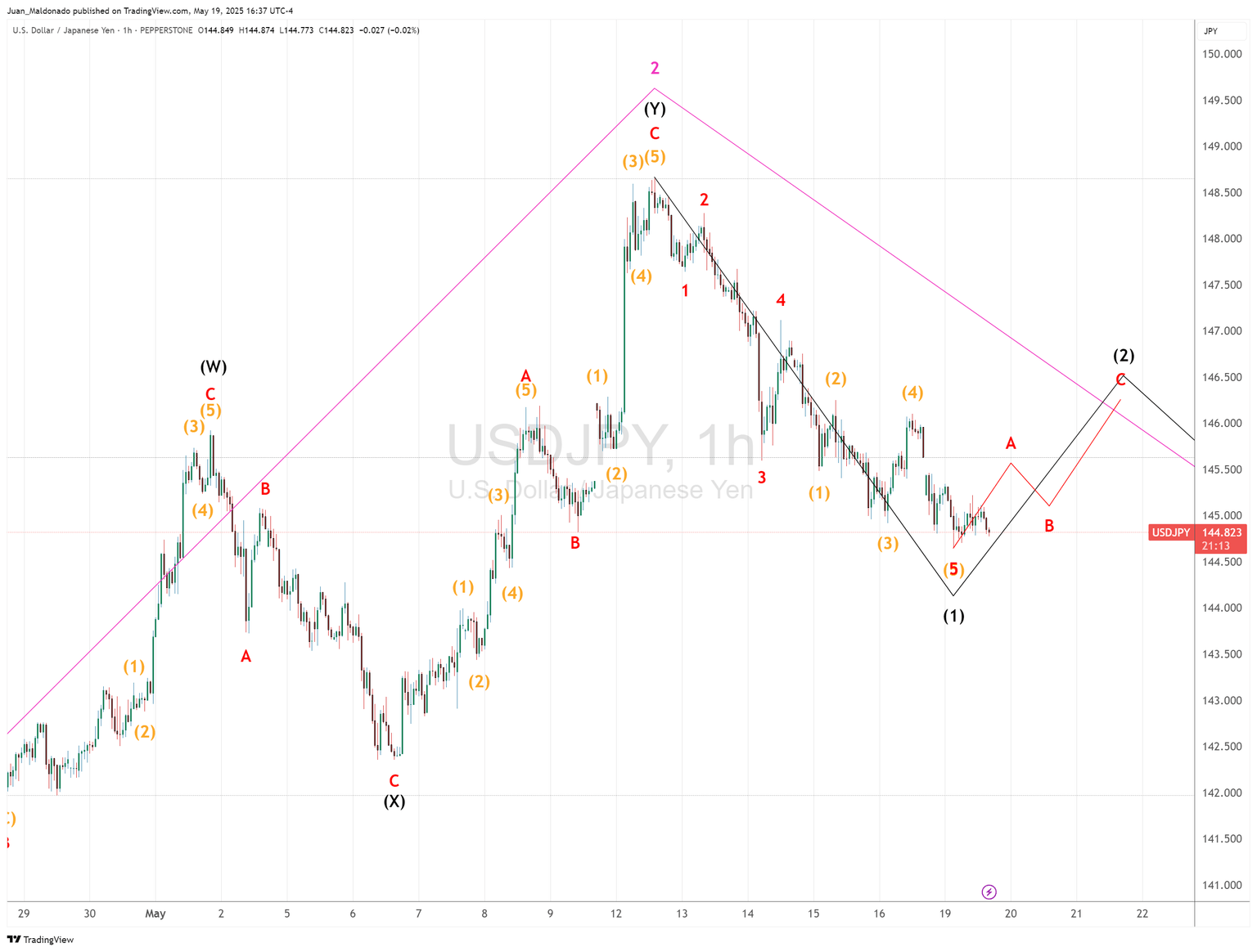 Esta semana, el USD/JPY se posiciona como uno de nuestros instrumentos favoritos para operar, ya que se encuentra en una fase técnica clave dentro de su estructura de ondas según la teoría Elliott Wave. De acuerdo con el conteo reflejado en el gráfico de 1 hora, el par ha completado un movimiento impulsivo bajista etiquetado como onda (1), y actualmente se desarrolla un retroceso correctivo que correspondería a la onda (2).