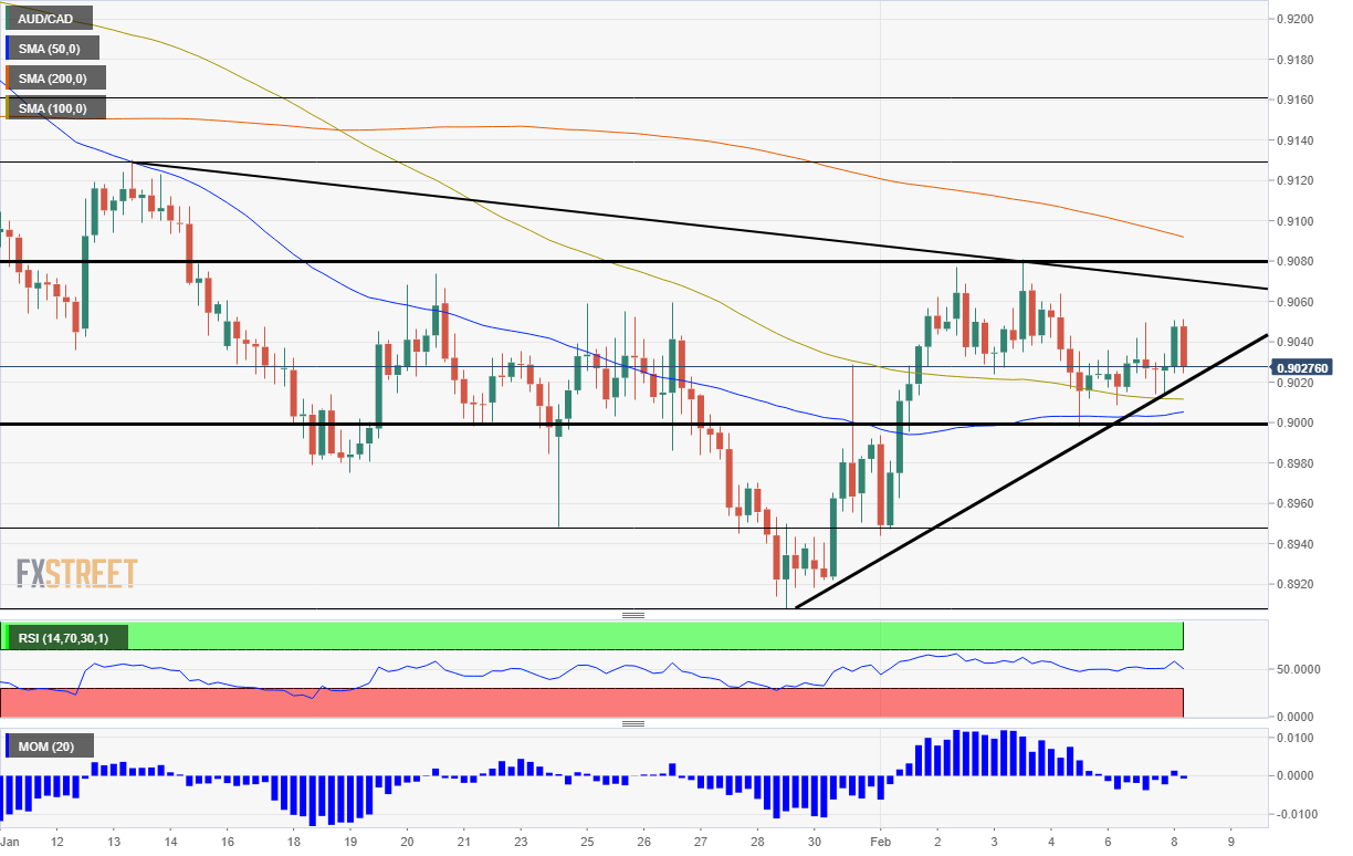 Técnicamente, el AUD/CAD ha estado marcando mínimos más altos desde que tocó fondo a finales de enero en 0.8910. Esta línea ahora ha sido probada en 0.9025 y parece sólida. Además, el cruce ha superado las SMA 50 y 100 en el gráfico de 4 horas en su camino hacia arriba, poniendo impulso temporalmente en territorio positivo.
