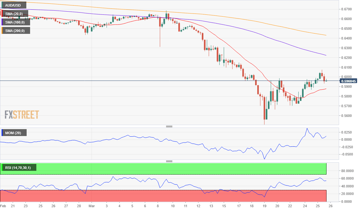 Ahora cotizando a alrededor de 0.5960, el par AUD/USD se mantiene en terreno positivo, aunque pierde su potencial alcista. En el gráfico de 4 horas, el par se mantiene por encima de su SMA de 20, que mantiene una pendiente levemente alcista, aunque por debajo de la SMA de 100 firmemente bajista. Mientras tanto, los indicadores técnicos se alivian dentro de niveles positivos, manteniéndose por ahora por encima de sus líneas medias.