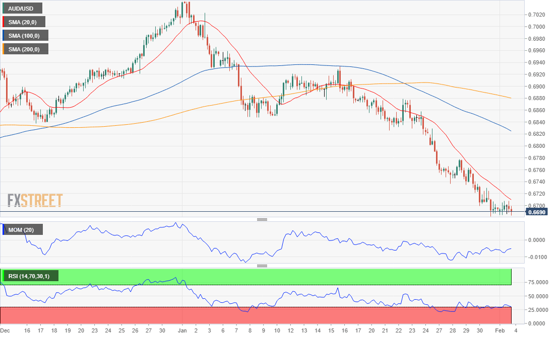 El par AUD/USD cotiza alrededor de 0.6690 en dirección a la apertura asiática, manteniendo su posición bajista de acuerdo con el gráfico de 4 horas, ya que el par continúa desarrollándose por debajo de una SMA de 20 firmemente bajista. Los indicadores técnicos permanecen dentro de los niveles negativos, el Momentum se recupera modestamente pero el RSI aún se consolida cerca de las lecturas de sobreventa. La imagen sigue siendo la misma con un descenso más pronunciado esperado en un descanso por debajo de 0.6670, el soporte inmediato.