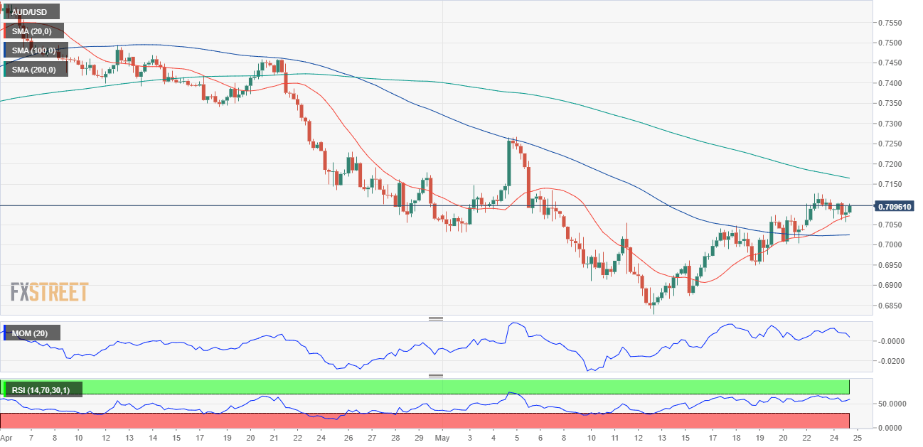 El par AUD/USD no pudo mantenerse por encima de 0.7100, el retroceso del 61.8% de su caída de 0.7265/0.66828, encontrándose con vendedores a su alrededor. El gráfico diario muestra que el par se mantiene por encima de una SMA de 20 sin dirección, que se mantiene un puñado de pips por debajo del soporte inmediato de Fibonacci en 0.7045. El indicador Momentum retrocedió bruscamente desde su línea media, mientras que el RSI se mantiene estable dentro de los niveles neutrales, lo que sugiere un menor interés de compra.