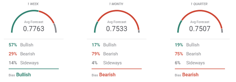 Según la Encuesta de Previsión de Divisas de FXStreet, el par mantendrá su postura alcista a corto plazo, pero luego sufrirá un cambio de sentido. Desde un objetivo promedio de 0.7763, el par se ve en 0.7533 en un mes. En la perspectiva trimestral, los bajistas mantienen el control aunque, en promedio, se considera que el par se mantiene por encima de 0.7500.