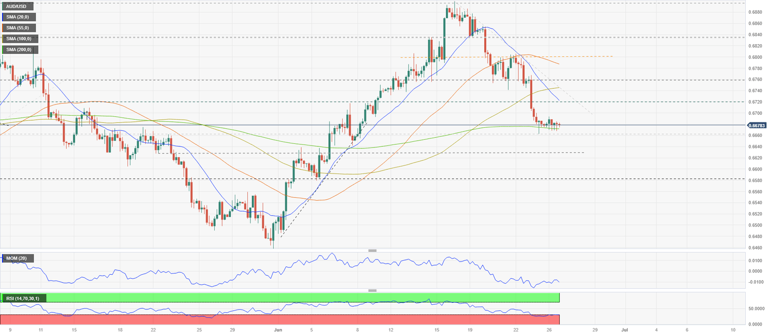 - El Impulso sigue siendo negativo para el AUD/USD, con un fuerte soporte en torno a 0.6640.