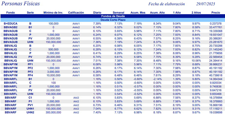 En el caso de BBVA México, observamos que el Fondo de Deuda de Corto Plazo BBVALIQ UHN arroja un rendimiento del 9.16% en un año, con un monto mínimo de inversión de 150 millones de pesos.