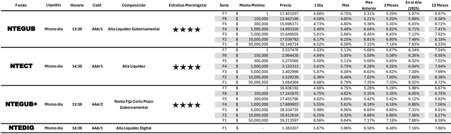 Por otro lado, Banorte registra un rendimiento del 8.59% en los últimos doce meses para el Fondo de Deuda de Corto Plazo NTEGUB+, para un monto mínimo de inversión de 50 millones de pesos.