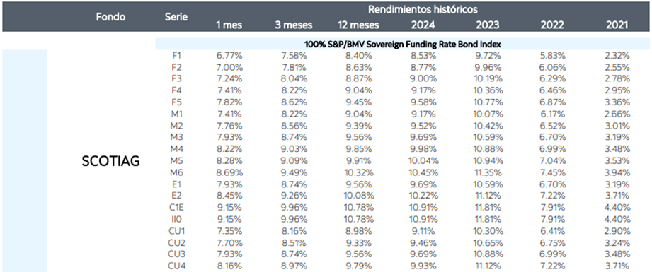 A la par, Scotiabank presenta un rendimiento de un 10.78% en el mismo periodo para el Fondo de Deuda de Corto Plazo SCOTIAG dirigido al segmento Wealth Management, que con base en su guía de servicios de inversión, requiere un saldo mínimo de 8 millones de pesos.