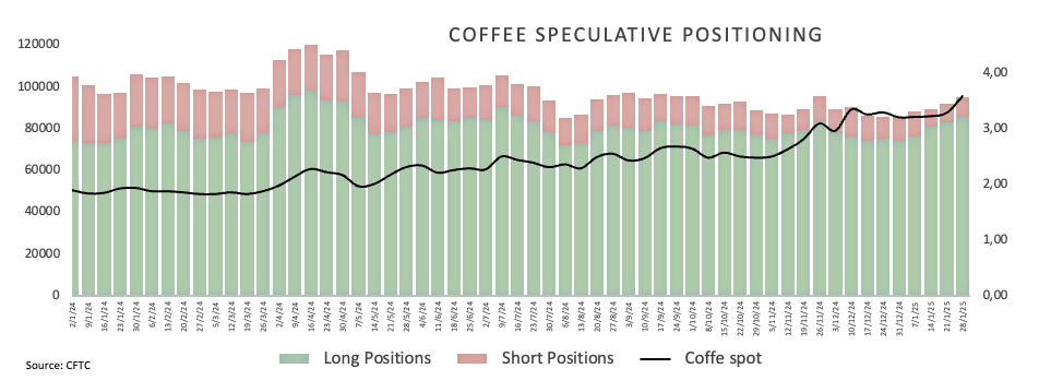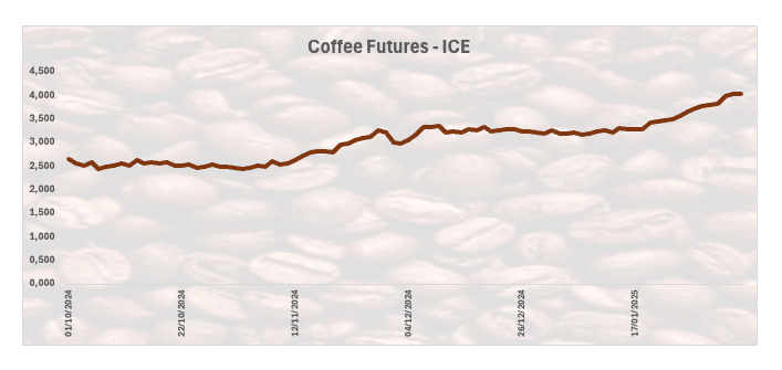 Los futuros del café arábica en la Intercontinental Exchange (ICE) superaron los 4.10$ por libra por primera vez en la historia el 6 de febrero. Los inversores están reconsiderando sus perspectivas sobre la cosecha brasileña del próximo año, mientras que las crecientes preocupaciones sobre la cosecha de robusta de Vietnam se suman a la incertidumbre general del mercado. Aunque los cafés robusta y arábica atienden a diferentes segmentos (mezclas de tostado y molido frente a café instantáneo), son algo intercambiables. En consecuencia, una escasez en uno a menudo aumenta la demanda del otro, intensificando las presiones generales sobre los precios.