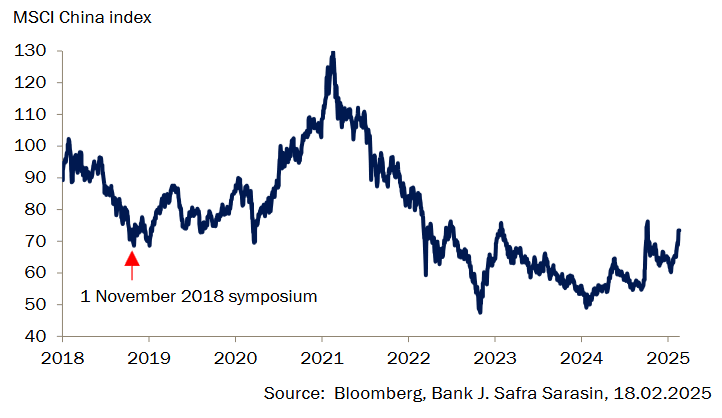 Recientemente ha habido algunas señales alentadoras de apoyo gubernamental a la economía: el impulso crediticio positivo de los dos últimos meses y el simposio con los principales líderes del sector privado para reforzar la confianza entre las empresas privadas. Este último fue similar al celebrado a finales de 2018, que parecía proporcionar un suelo a la renta variable china hasta 2020. El momento del simposio del lunes pasado sugiere el deseo de aprovechar el impulso positivo, provocado por el lanzamiento del modelo de IA de DeepSeek. A corto plazo, la concesión de ayudas fiscales y las reformas por parte del Gobierno en marzo continúan siendo clave para impulsar la confianza de los consumidores y el mercado de renta variable. La aparición de Deepseek no sólo ha apoyado a la renta variable china, sino que también nos ha llevado a ser más optimistas sobre las perspectivas de crecimiento del país a medio plazo, ya que la adopción de la IA debería traducirse en mayores ganancias de productividad.
