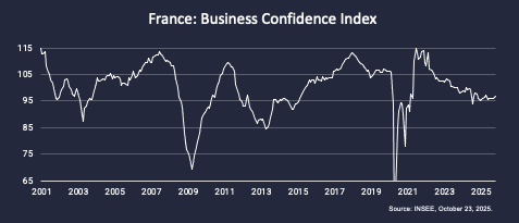 La oficina nacional de estadísticas francesa (INSEE) ha publicado esta semana sus indicadores de confianza empresarial de octubre. Los datos se basan en respuestas recopiladas entre el 26 de septiembre y el 20 de octubre, en su mayoría antes del 10 de octubre, es decir, durante el breve mandato del primer gobierno de Sébastien Lecornu, que rápidamente se derrumbó.