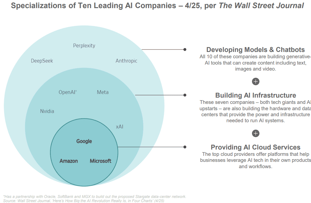 Este escenario ha abierto oportunidades de inversión en tres frentes: (1) proveedores de infraestructura (NVIDIA, Oracle, CoreWeave), (2) software empresarial que integra IA en flujos de trabajo (Microsoft, Salesforce, Adobe) y (3) verticales especializadas en IA prioritaria en los sectores sanitario, jurídico e industrial (p. ej., Abridge, Harvey, Anduril). Mientras tanto, las LLM de código abierto de China están reduciendo rápidamente la brecha de rendimiento, lo que plantea consideraciones geopolíticas y competitivas.