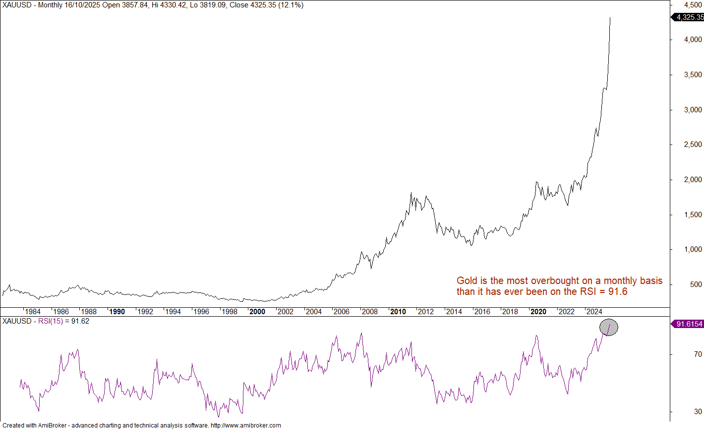 El Oro está ahora más sobrecomprado que nunca en la historia en una base mensual utilizando el RSI (índice de fuerza relativa) en 91.6