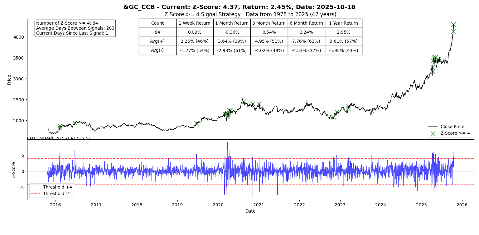 Ayer, el Oro hizo otro movimiento contundente hacia arriba con un impulso de Z-score de más de 4, solo la 84ª vez en su historia. Estoy tomando beneficios con el 10% de mis tenencias de oro, puramente desde una perspectiva de trading a corto plazo.