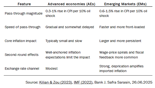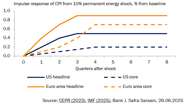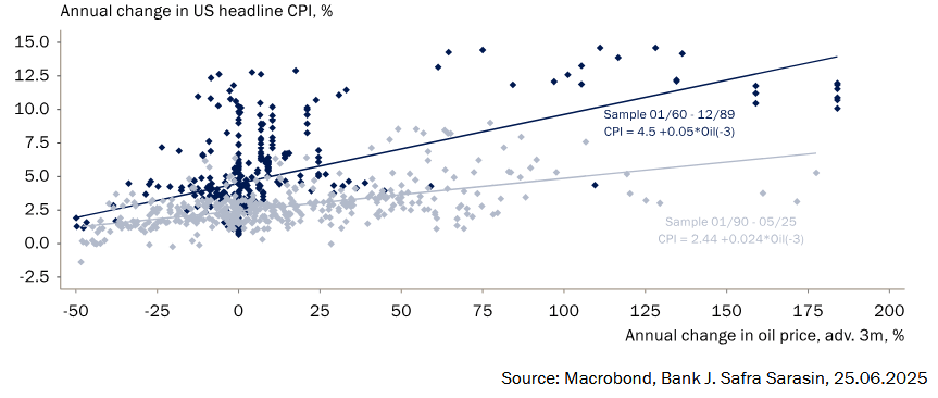 Los precios del petróleo afectan a la inflación a través de dos canales: directamente a través del consumo de energía, como el combustible, e indirectamente a través del aumento de los costes de producción y los efectos secundarios, incluidos los incrementos salariales y el cambio de las expectativas de inflación. Según un reciente estudio de la Fed sobre 27 economías avanzadas, el consumo directo de energía representa algo más del 60% del impacto inicial, mientras que los efectos indirectos suponen el resto.