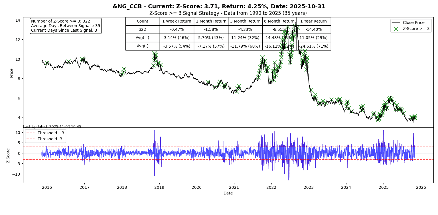 Honestamente, no sé cómo puedes operar gas natural en estos días. Un evento de tres sigmas es casi una ocurrencia diaria. Sí, la respuesta obvia es operar en menor escala, pero un instrumento tan volátil es simplemente difícil de manejar. Debo mencionar que utilizo una ventana de retroceso en expansión para mi cálculo de puntaje Z, lo que significa que sigo agregando historia al cálculo para que pueda distinguir lo anormal de lo normal.