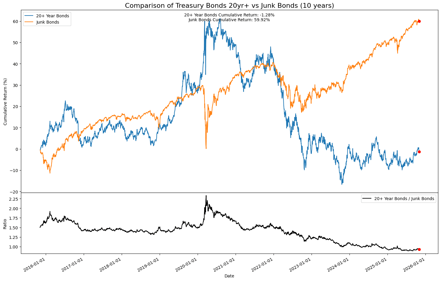 Creo que los bonos basura se han estado negociando más como acciones de crecimiento que como bonos de alto rendimiento. Por lo tanto, creo que la relación en el gráfico a continuación pronto comenzará a subir a medida que los bonos basura se vendan y los bonos del Tesoro a largo plazo se negocien al alza en una base relativa. He utilizado los ETFs JNK (Basura) y TLT (Bonos del Tesoro a 20 años o más) para expresar el comercio.