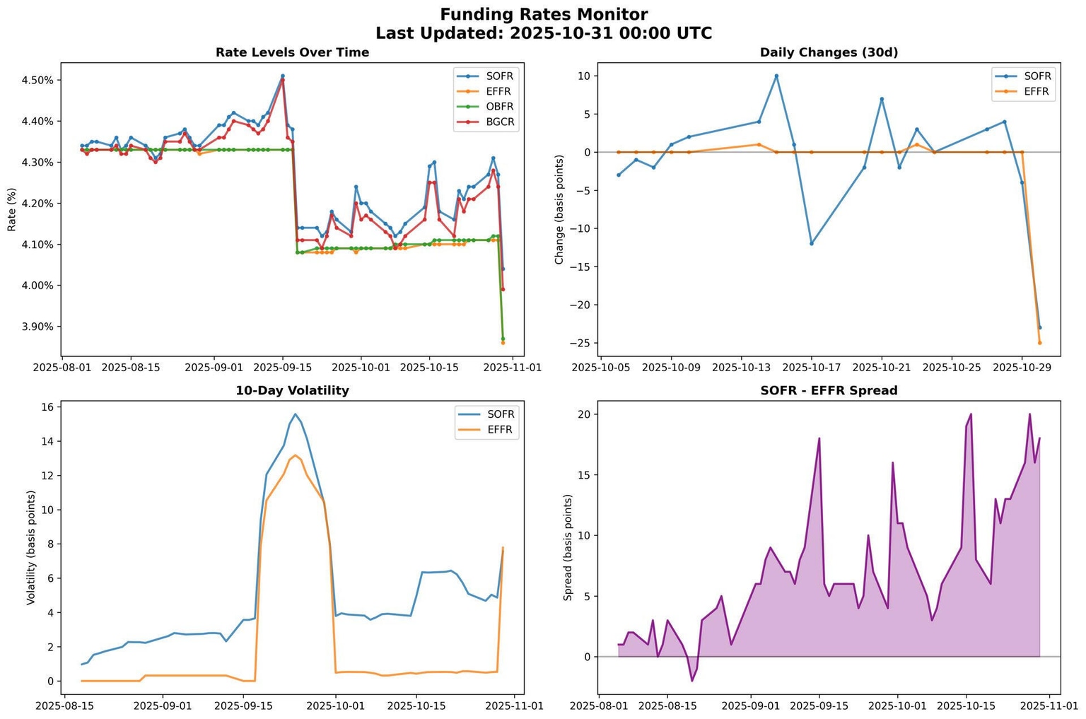 Una de las métricas más críticas a tener en cuenta es el spread = SOFR − EFFR, ya que muestra cómo el mercado asegurado se negocia en relación con el no asegurado. Hay mucho que desglosar en esta declaración. Muchos de ustedes pueden no estar familiarizados con estas instalaciones monetarias, así que revisémoslas pronto. Por ahora, simplemente reconozcamos que podría haber algo de qué preocuparse. Y sí, la intención era reducir las tasas como pueden ver a continuación.