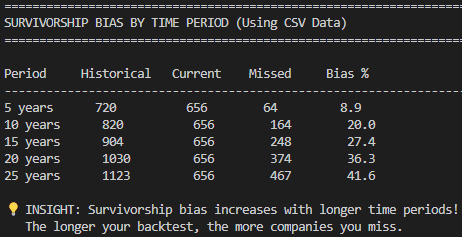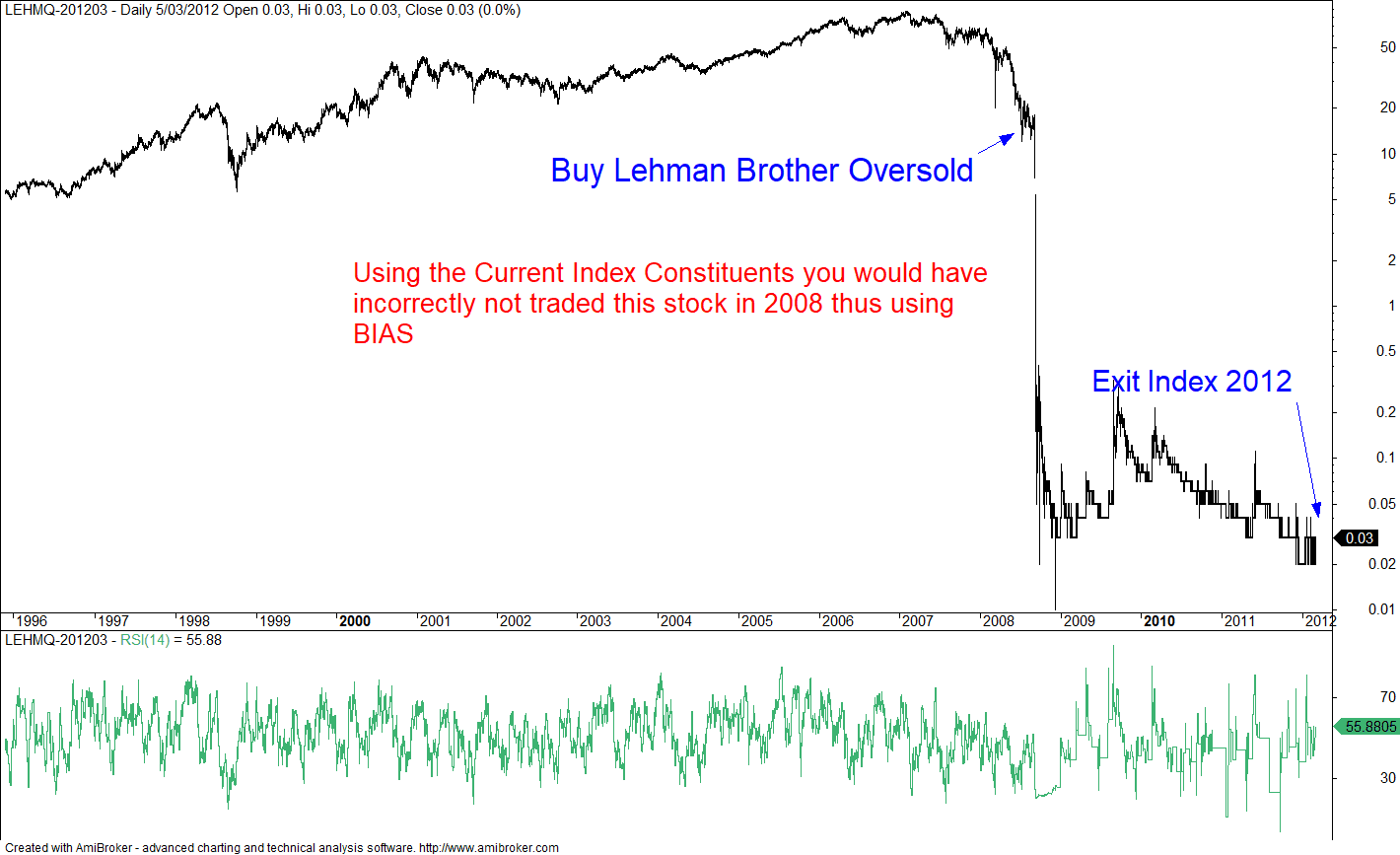 Hay otra expresión de este mismo sesgo. Nuevamente, si estás usando los componentes del índice hoy, no habrías invertido en, digamos, Lehman Brothers porque ya no está en el índice. Sin embargo, si hubieras utilizado el índice correcto en ese momento en 2008, tu sistema lo habría estado comprando, ya que estaba sobrevendido en 2008. Así que el sesgo te está dando un pase libre que no habría existido en la realidad.