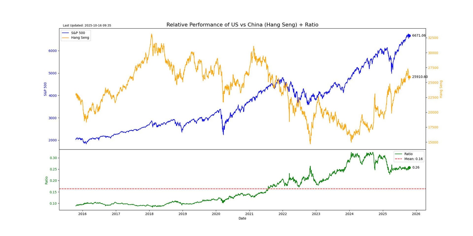 Solo para confundir mis comentarios sobre el estatus de superpotencia de América arriba, me mantengo con mi posición larga en China (a través del índice Hang Seng) y corta en EE.UU. Estoy buscando que la relación verde alcance o supere la media punteada roja. Creo que estamos a punto de entrar en el final tenso de la guerra comercial; esta será una guerra de desgaste. Me alegra ver que el WSJ está de acuerdo con mi tesis de que el mercado de valores es el talón de Aquiles de EE.UU., que el juego a largo plazo de China busca explotar.
