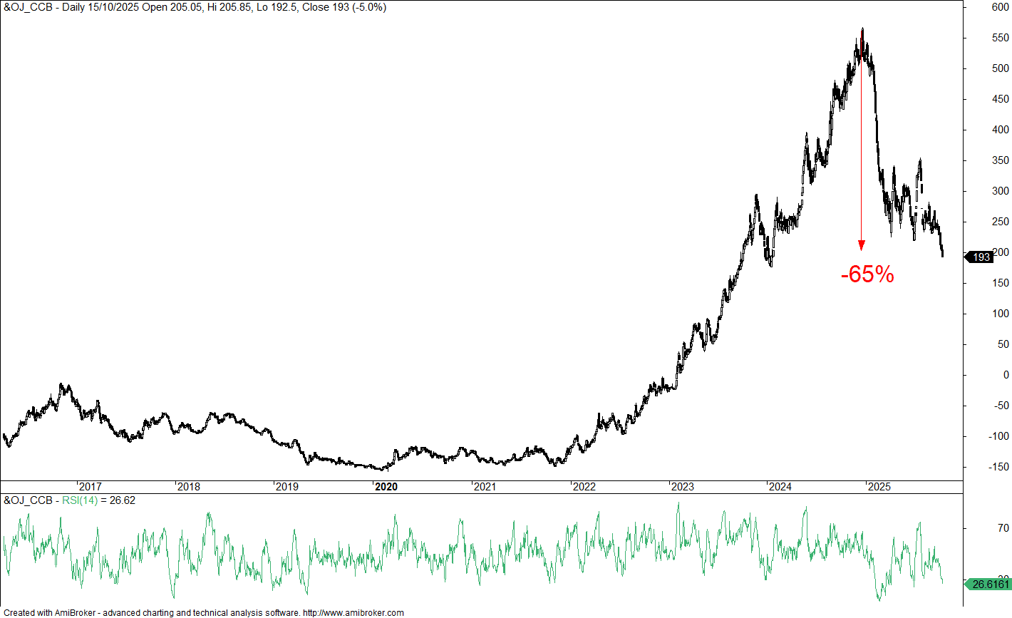 No sé ustedes, pero tengo sed. El jugo de naranja está en camino de ser asequible nuevamente. Ha bajado un 65% desde sus máximos.