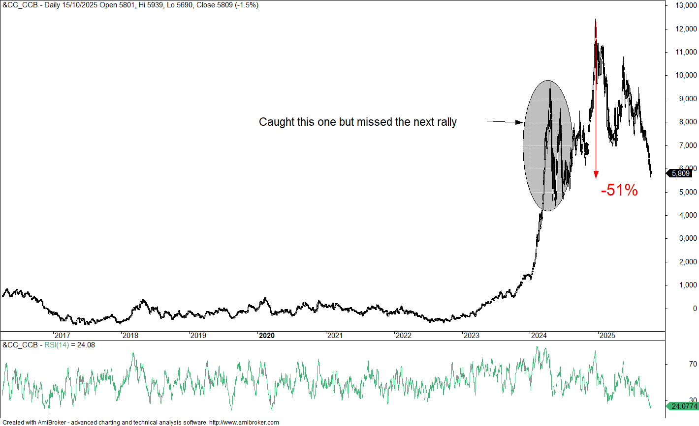 Otro producto básico que disparó a territorio de burbuja que capturamos para la primera caída fue el cacao. Actualmente ha bajado un 51% desde su máximo histórico. No solo tengo sed; también anhelo algo dulce.