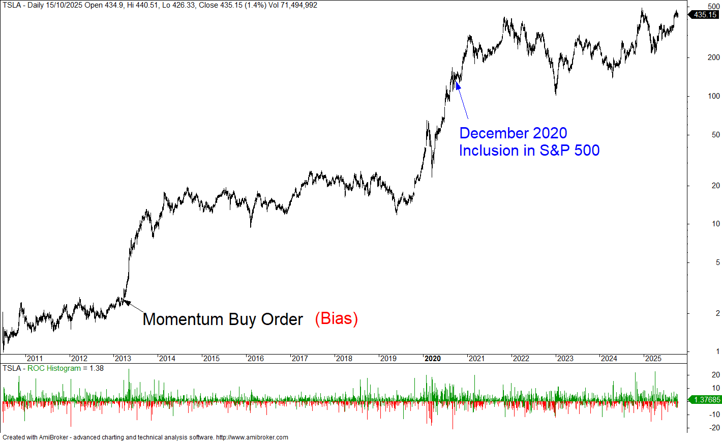 Supongamos que tienes un filtro que solo te permite comerciar símbolos que son parte del S&P 500 que cumplen ciertos criterios. Ejecutas tu prueba retrospectiva comenzando hace 19 años con los componentes actuales del S&P 500, y muestra una compra para Tesla hace 10 años. Tenemos un problema de sesgo, ya que Tesla solo se agregó al S&P 500 en diciembre de 2020.