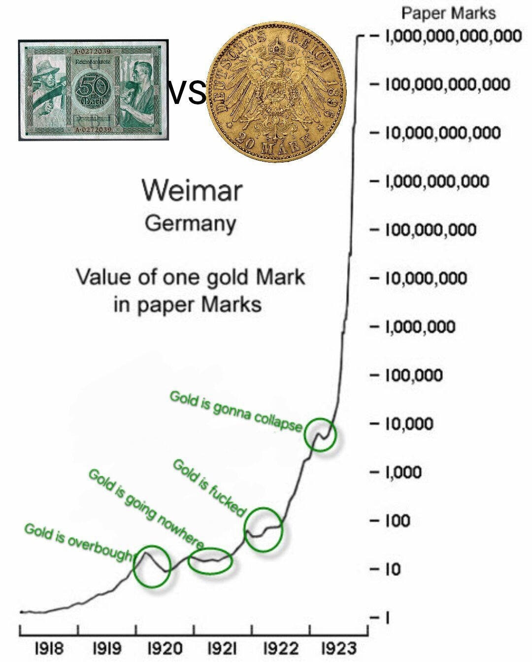 Personalmente, no creo que el dólar estadounidense pueda ser comparado directamente con el marco alemán de Weimar. Soy un verdadero creyente en el estatus de superpotencia de América y su capacidad para fomentar el capitalismo como ningún otro país. Sin embargo, cosas extrañas pueden suceder cuando estás en una pendiente resbaladiza.