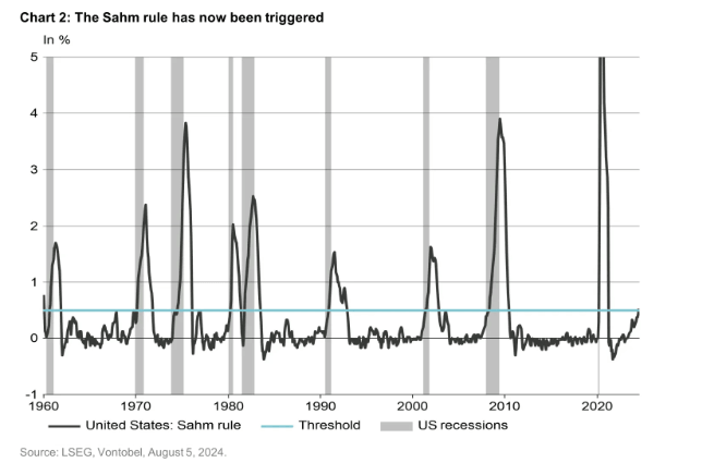 En consecuencia, el "indicador Sahm de recesión", acuñado por la economista estadounidense Claudia Sahm, también dio la voz de alarma (gráfico 2). Dicho indicador se considera un testigo bastante fiable de una recesión. Se activa cuando la media móvil de tres meses de la tasa de desempleo de EE.UU. sube 50 puntos básicos desde un mínimo de 12 meses.