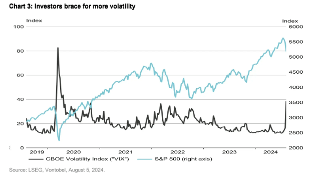 El llamado índice VIX, que mide la volatilidad esperada por el mercado para el S&P 500 durante un periodo de 30 días, superó los 65 puntos intradía el 5 de agosto, y cerró justo por debajo de los 40 puntos (gráfico 3).