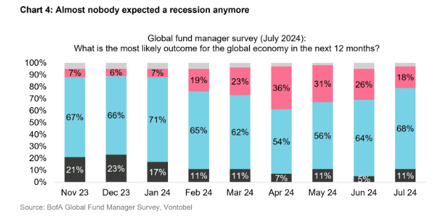 En el pasado ya hemos señalado repetidamente que creemos que los mercados se muestran excesivamente optimistas sobre la economía estadounidense. Así lo refleja, por ejemplo, la Encuesta Global de Gestores de Fondos de Bank of America, según la cual la mayoría de los encuestados (68%) espera un "aterrizaje suave" de la economía, es decir, una vuelta de la inflación al objetivo del 2% de la Fed sin recesión (gráfico 4).