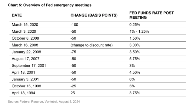 Desde 1994, la Fed ha celebrado un total de once reuniones de emergencia, la última en marzo de 2020, cuando bajó el tipo de interés oficial de EE.UU. en 100 puntos básicos (gráfico 5).