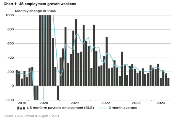 Apenas dos días después, las tornas cambiaron: El dato de empleo de EE.UU. del viernes mostró que en julio sólo se crearon 114.000 puestos de trabajo (gráfico 1). Esta cifra fue muy inferior a los 175.000 puestos de trabajo esperados. Además, los datos de mayo y junio se revisaron a la baja (de 206.000 a 179.000, y de 218.000 a 216.000, respectivamente). La tasa de desempleo también levantó ampollas, al pasar del 4,1% al 4,3%.