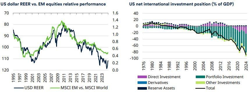 En la actualidad, el tipo de cambio efectivo real ponderado por el comercio (REER por sus siglas en ingés) del dólar está muy valorado, Estados Unidos sufre un amplio déficit gemelo y los mercados de valores estadounidenses tienen precios relativamente altos. Los inversores están muy expuestos a los activos estadounidenses, de modo que la posición de inversión internacional neta (NIIP, ver el gráfico de la derecha) se ha ampliado, los bancos centrales globales están diversificando sus reservas alejándose del dólar (a pesar de que este sigue siendo la moneda de reserva y comercial dominante en el mundo) y algunos elementos de la política de la Administración estadounidense han erosionado la confianza en la tesis del excepcionalismo estadounidense. El Dólar ya se ha depreciado notablemente este año, pero hay razones para pensar que podríamos continuar en un ciclo de depreciación del dólar que podría prolongarse durante algún tiempo. Esto debería suponer un fuerte impulso para la rentabilidad de los mercados emergentes.