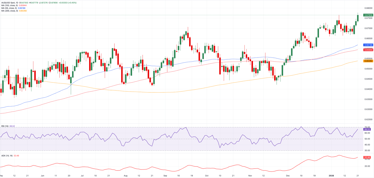 - El Aussie alcanza nuevos máximos de 2026 cerca de 0.6780 el miércoles.