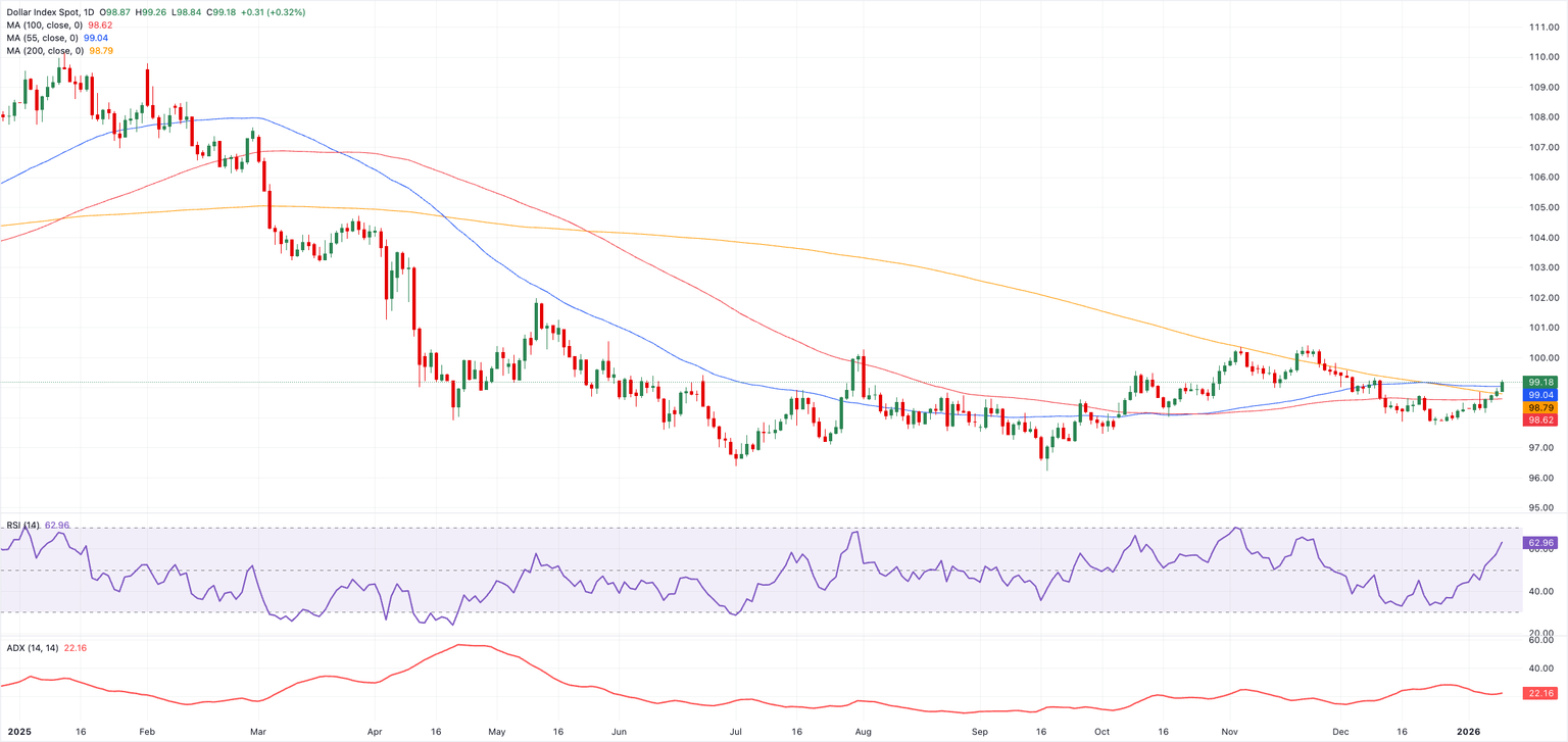 Desde que tocó fondo cerca de 97.70 el 24 de diciembre, el Índice del Dólar estadounidense (DXY) ha emprendido una sólida recuperación que no solo ha reclamado la barrera de 99.00, sino que también ha dejado atrás su significativa SMA de 200 días alrededor de 98.80.