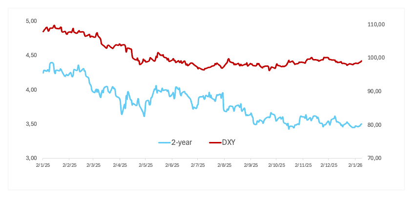 Hasta ahora, las tasas implícitas apuntan a poco más de 53 puntos básicos de alivio para fin de año y alrededor de un 95% de probabilidad de una decisión de mantener las tasas en la reunión del 28 de enero.
