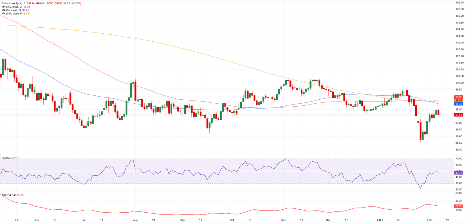 Una vez que el índice supere esta región, podría intentar una prueba de la banda de 98.50-98.70, donde convergen las SMA de 55 días y 100 días interinas y la SMA de 200 días más relevante. Al norte de aquí aparece el techo de 2026 en 99.49 (15 de enero).
