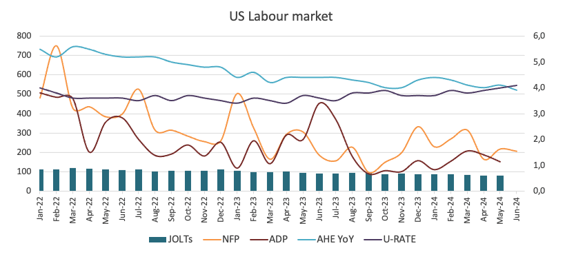 Lo anterior se sustentó principalmente en los resultados desalentadores de los fundamentos de EE.UU. a lo largo de la semana, con el enfoque ostensiblemente en el mercado laboral y, en segundo lugar, en el sector de servicios. La excepción fue, una vez más, otro sólido informe de las Nóminas no Agrícolas de EE.UU., donde la economía añadió más empleos de los inicialmente estimados en junio (+206.000), aunque la Tasa de Desempleo aumentó por tercer mes consecutivo, alcanzando ahora el 4,1%.