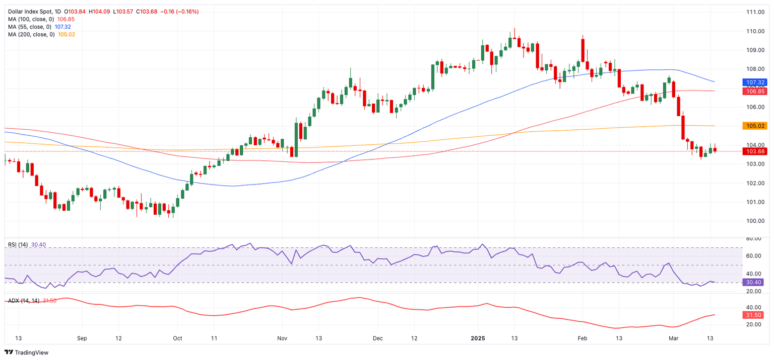 El Dólar estadounidense (USD) se mantuvo a la defensiva por segunda semana consecutiva, arrastrando al Índice del Dólar estadounidense (DXY) a nuevos mínimos de cinco meses en el rango de 103.25-103.20 el 11 de marzo. Hasta ahora, esta zona ha proporcionado un soporte inicial, desacelerando el impulso de la venta masiva.