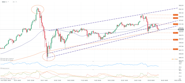 En el gráfico H4, el oro opera cerca de 5.073 y se mantiene en una fase correctiva tras fallar en sostener los máximos recientes, con el precio por debajo de la SMA50 y apoyándose cerca de la SMA200 y de la parte baja del canal ascendente (líneas punteadas), zona que hoy actúa como pivote técnico.