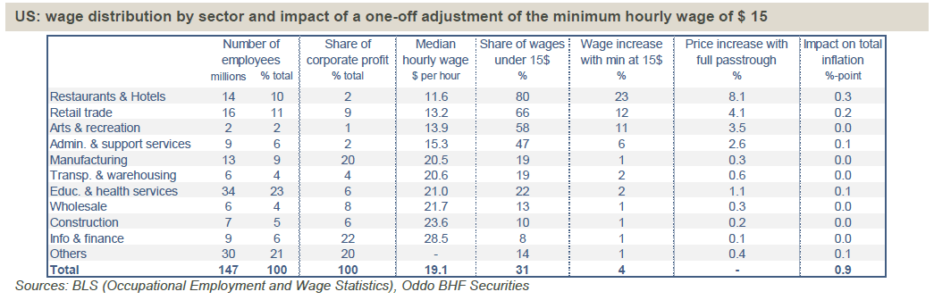 Una encuesta anual del BLS detalla los niveles salariales de 800 ocupaciones diferentes. Utilizamos datos de 2019, la última encuesta no sesgada por la pandemia. En ese momento, los salarios inferiores a 15 dólares/hora se pagaban al 31% de los empleados (para el 15% de la nómina total). Pero esta proporción llegaba al 80% en el caso de la hostelería y el 66% en el comercio minorista (cuadro). Para hacernos una idea de un choque salarial, supongamos que el mínimo se eleva repentinamente a 15 $. Para los hoteles y restaurantes, esto implicaría un aumento del 23% de los salarios, para el comercio minorista un 12%; dada la parte de los salarios en los costes, el impacto en los precios sería del 8% y del 4%, respectivamente, si la repercusión fuera total. En total, el efecto inflacionista sería de 0,9 puntos porcentuales. Este cálculo es incompleto. No tiene en cuenta los efectos de segunda ronda que podrían reforzar el impacto inflacionista, ni los posibles aumentos de productividad que actúan en la otra dirección1. La reapertura de la economía tras la pandemia ha magnificado la rotación de trabajadores. Por lo tanto, hay presiones salariales, pero hasta la fecha, principalmente localizadas en los sectores de bajos salarios que representan alrededor del 20% de la mano de obra y el 10% del conjunto de beneficios.