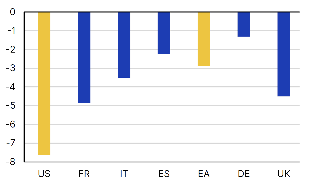 Estados Unidos también se beneficia de los mercados de capitales más sólidos del mundo, con una capitalización bursátil tres veces mayor que la europea (en relación con el PIB respectivo), lo que facilita una financiación fácil y amplia para las empresas estadounidenses. Esto contrasta con la financiación europea, basada en gran medida en los bancos, lo que impulsa la ambición de los responsables políticos de la UE de fomentar la unión de los mercados de capitales europeos para facilitar la financiación y apoyar las perspectivas de crecimiento de Europa.