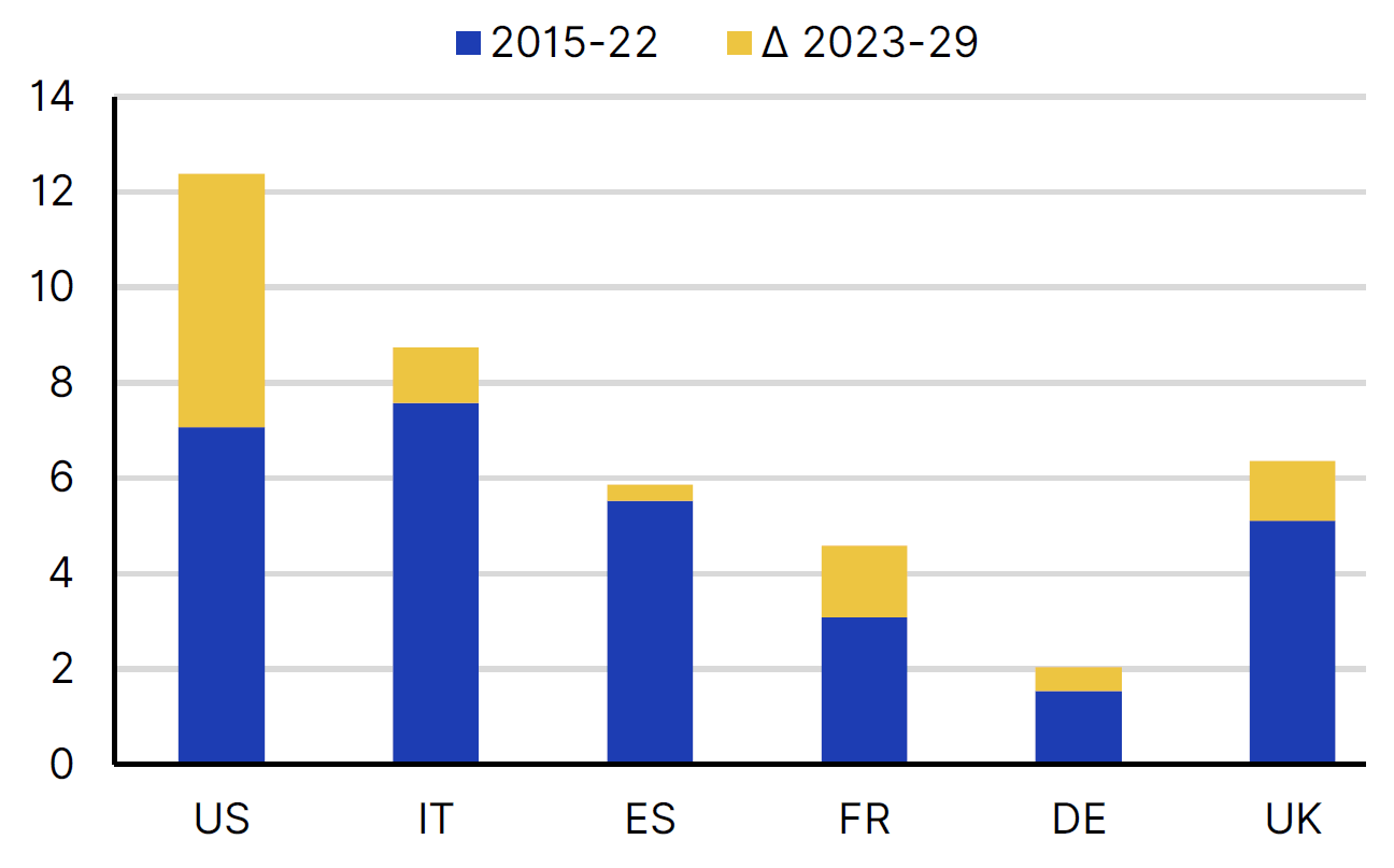 Es inflacionista, aumenta las primas de riesgo en el extremo más largo de la curva de rendimientos y reduce la inversión privada. La subida de los tipos de interés, a pesar de los recientes recortes, unida a los persistentes déficits presupuestarios de entre el 6% y el 8% del PIB, se traduce en un aumento de los pagos de intereses, que superarán el 10% de los ingresos públicos en los próximos años. Las perspectivas presupuestarias de EE.UU. se caracterizan, pues, por un nivel elevado y creciente de deuda en relación con el PIB, que superará el 130% en los próximos años, y unos costes del servicio de la deuda superiores a los de Italia.