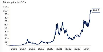 La semana pasada, el Bitcoin alcanzó por fin la barrera psicológica de los 100.000 dólares, después de haber subido a nuevos máximos históricos casi a diario en las semanas anteriores (Gráfico 1). Esta subida reciente se produjo tras el nombramiento de Paul Atkins como nuevo presidente de la Comisión de Bolsa y Valores (U.S. Securities and Exchange Commission o SEC, por sus siglas en inglés), que se percibió como una victoria de la «experiencia del establishment» entre los ejecutivos del sector. Como defensor de los criptoactivos, se espera que Paul Atkins adopte una postura más amistosa hacia el sector de las criptomonedas que su predecesor Gary Gensler, que dejará el cargo el próximo mes de enero. Bajo la dirección de Gensler, la SEC tomó medidas drásticas contra el sector de las criptomonedas con numerosos juicios por fraude y blanqueo de dinero, que dieron lugar a multas de miles de millones de dólares, con Binance y Coinbase entre los principales objetivos.